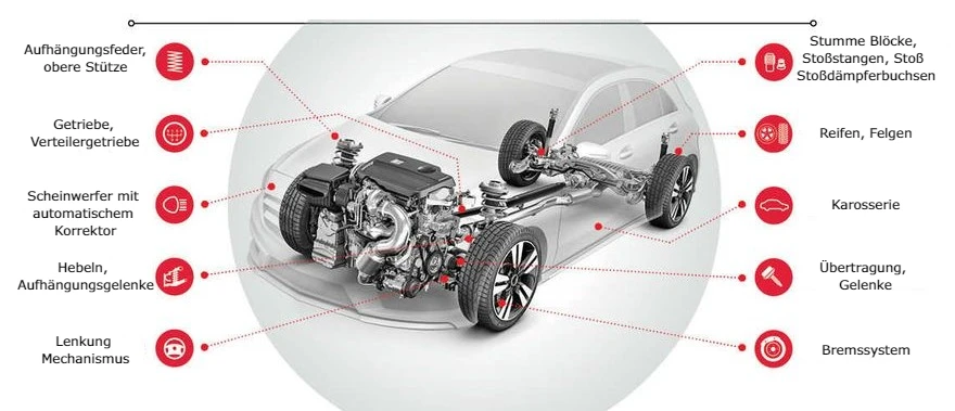 - Erhöhter Verschleiß von Reifen, Gummibuchsen, Silentblöcken, Stoßstangen und Federn sowie anderen Elementen der Fahrzeugaufhängung.