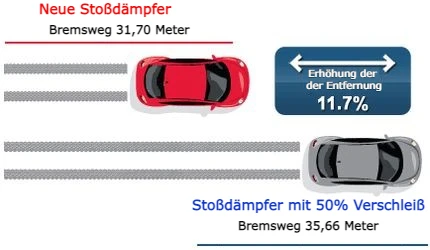 - Verlängerter Bremsweg. Dieser Faktor wird durch das gleiche Schwanken beim Bremsen verursacht. Wenn der Stoßdämpfer die Schwingungen nicht mehr dämpft, senkt sich das Fahrzeug beim Bremsen periodisch ab und hebt den vorderen Teil der Karosserie an. Dadurch wird die Last auf den Vorderrädern reduziert, was die Wirksamkeit der Bremsen verringert.