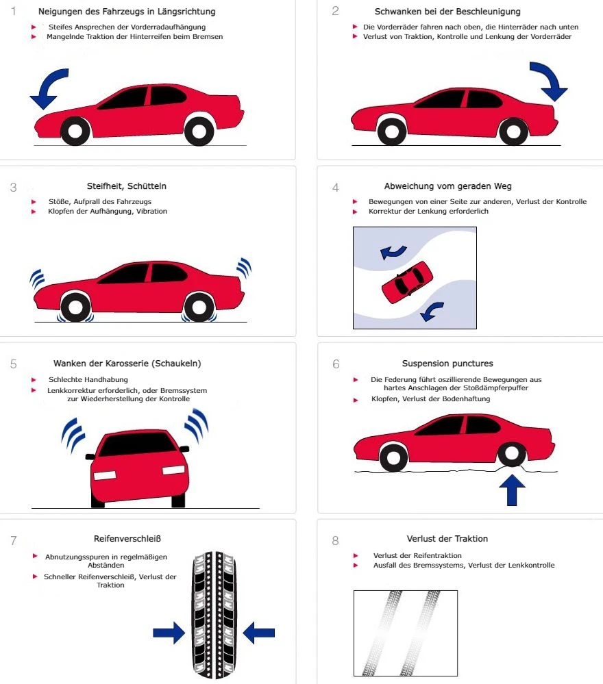 - Unbehagen beim Fahren. Es kann sich auf unterschiedliche Weise äußern. Insbesondere leiden manche Fahrer und/oder Beifahrer während der Fahrt über einen längeren Zeitraum an «Seekrankheit», weil das Fahrzeug schwankt. Dieser Effekt ist ein typisches Symptom für defekte hintere Stoßdämpfer.