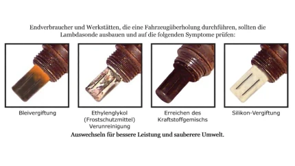 - Verunreinigung des Sensors durch Verbrennungsprodukte des Kraftstoffs. Im Laufe des Betriebs wird die Lambdasonde aus natürlichen Gründen allmählich verunreinigt, und mit der Zeit kann sie keine korrekten Informationen mehr übermitteln. Aus diesem Grund empfehlen die Automobilhersteller, die Sonde in regelmäßigen Abständen durch eine neue zu ersetzen, wobei der Originalsonde der Vorzug zu geben ist, da die Universal-Lambdasonde die Informationen nicht immer korrekt anzeigt. Es gibt jedoch mehrere Möglichkeiten der Reinigung, sowohl mit Hilfe spezieller Flüssigkeiten als auch einfach dadurch, dass man den Motor lange Zeit mit erhöhter Drehzahl laufen lässt (es findet eine Selbstreinigung statt).