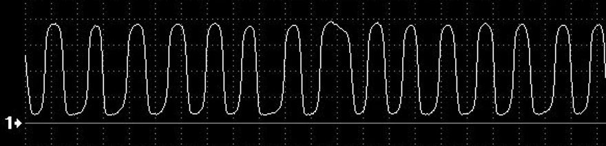 Das erste Diagramm in diesem Abschnitt zeigt den korrekten Betrieb der Lambdasonde. In diesem Fall liegt ein Signal vor, das wie eine gleichmäßige Sinuswelle auf dem Signalkabel aussieht. Die Sinuskurve bedeutet in diesem Fall, dass der von der Sonde überwachte Parameter (der Sauerstoffgehalt in den Abgasen) innerhalb der zulässigen Grenzen liegt und einfach kontinuierlich und regelmäßig überprüft wird.