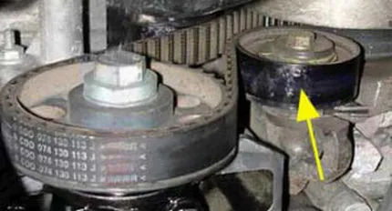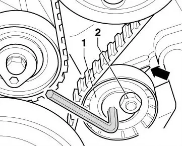 - Pour tendre la courroie de distribution, tournez le galet tendeur dans le sens inverse des aiguilles d'une montre dans la position où les deux pointeurs sont situés l'un contre l'autre (flèche A).