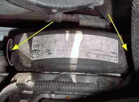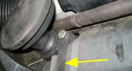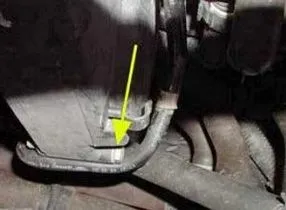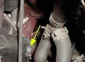 - En haut à gauche du radiateur, trouvez et débranchez le collier de serrage de la pompe de direction assistée, les extrémités du tube doivent être noyées avec des bouchons appropriés.