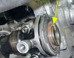 - La pompe. Avant l'installation, nous recommandons d'appliquer une légère couche de mastic sur une bague en caoutchouc, puis, mettez trois boulons pour le centrage de la pompe. Ne serrez que le boulon de droite, retirez les deux autres boulons.
