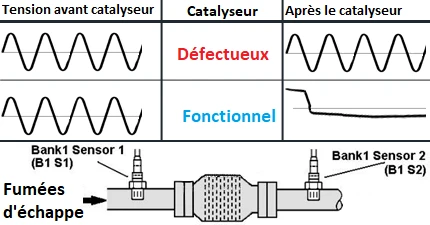 Pendant le fonctionnement normal du convertisseur catalytique, le signal de sortie de la sonde à oxygène passe lentement de l'état enrichi à l'état appauvri. Le passage fréquent de la sonde lambda d'un état à l'autre est une indication de la détérioration de l'efficacité du convertisseur catalytique. En conséquence, sa capacité à stocker l'oxygène est réduite.